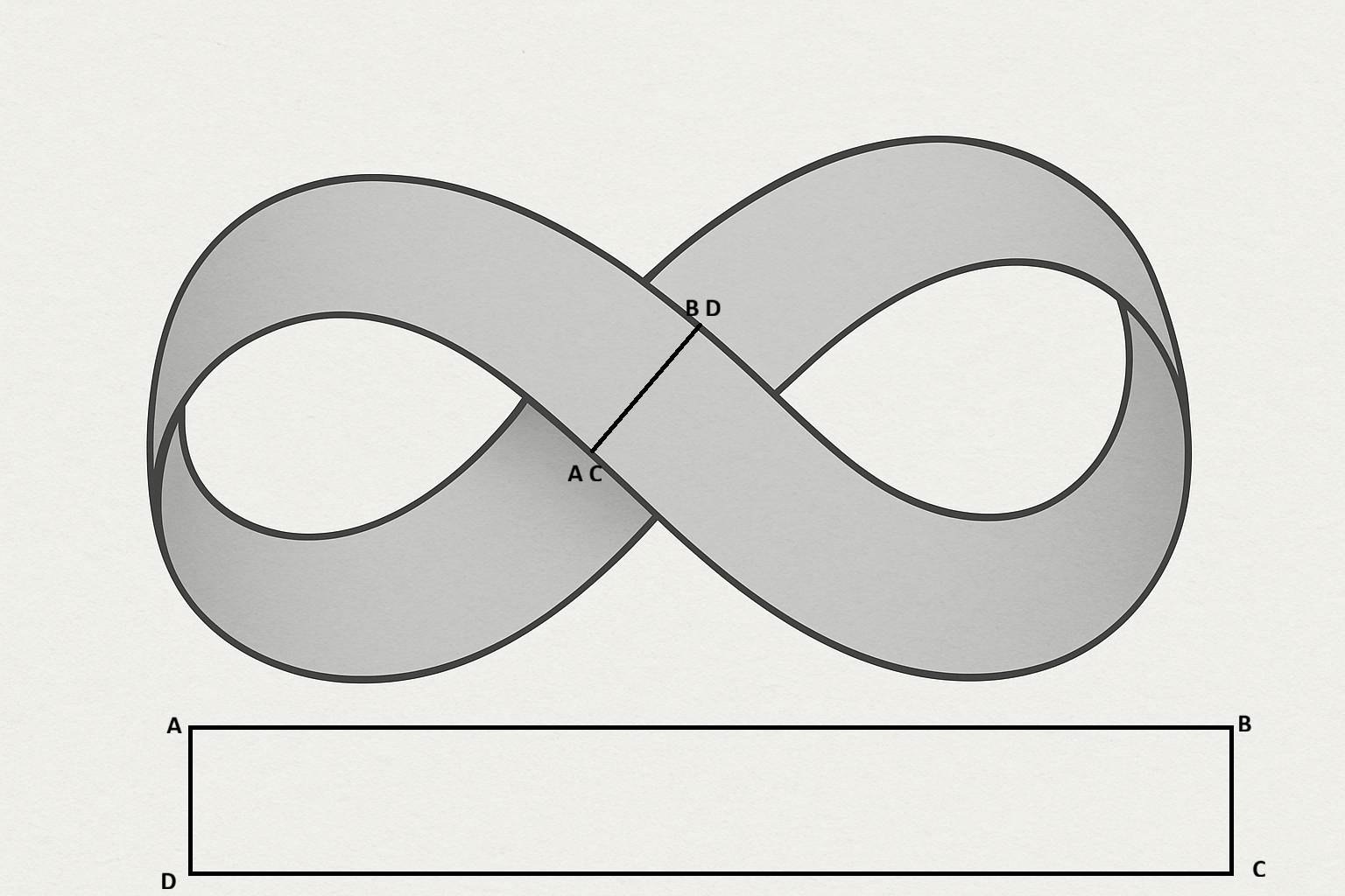 Prenez un rectangle de papier et coller les deux extrémités après avoir fait subir à cette bande une torsion de 180° (un demi-tour) selon son axe longitudinal et ainsi retourné face pour face l'une de ses extrémités. Vous venez de fabriquer une des plus fascinantes surfaces des mathématiques : le ruban de Möbius.