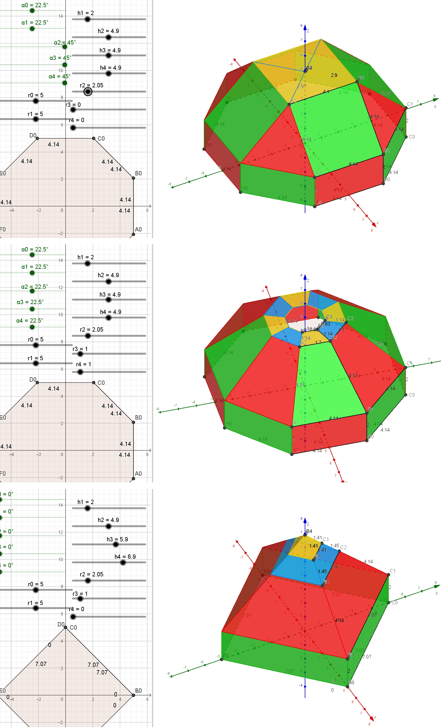 Je conçois le paramétrage de la figure, mais je suis épaté par la planéité des polygones ... Est-ce tout simplement que l'on n'impose pas une distance fixe au centre du polygone de base ? Je crois que je vais me mettre à Geogebra dès que j'en aurai le loisir ...