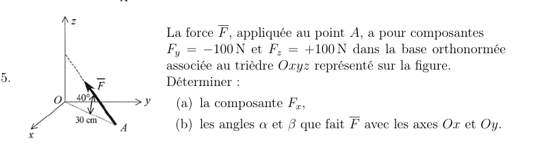 exercice : La force F ( vecteur ) , appliquée au point A , a pour composantes Fy = -100N et Fz = 100 N dans la base orthonormée associée au trièdre Oxyz représenté sur la figure?