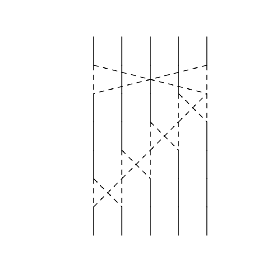 Les cinq roues suivantes sont destinées à la permutation de ces bits. Pour cela, cinq interrupteurs permettent, ou non, d'échanger deux bits. Leur position (échange ou non) est fixée en fonction de la position de la roue correspondante (1 ou 0). Le schéma suivant représente la position des cinq interrupteurs et leurs effets possibles. Par exemple, le premier interrupteur échange, ou non, le premier et le cinquième bit (mais laisse les autres inchangés), le deuxième interrupteur échange ou non le quatrième et le cinquième bit, etc...