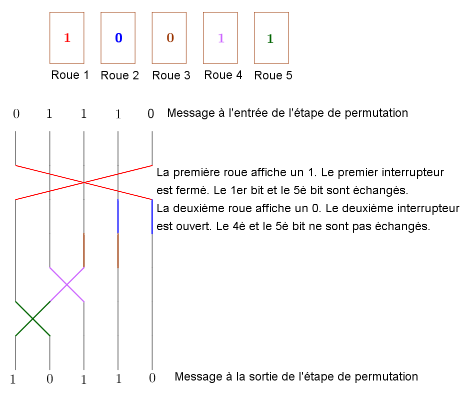Si on arrive à l'étape de permutation avec la suite de 5 bits $01110$, comme précédemment, et que la position des 5 roues donnant