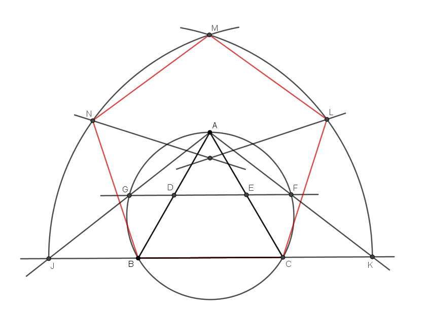 Reprenons la figure précédente : un triangle équilatéral $ABC,$ les milieux $D$ et $E$ des côtés $AB$ et $AC,$ la droite $(DE)$ et le cercle circonscrit à $ABC.$ Soit $F$ et $G$ les points d'intersection de cette droite avec les arcs $AC$ et $AB,$ respectivement, de ce cercle. Les demi-droites $[AG)$ et $[AF)$ coupent en $J$ et $K,$ respectivement, la droite $(BC)$. L'arc de cercle de centre $C$ et de rayon $CJ$ et celui de centre $B$ et rayon $BK$ se coupent en $M,$ la médiatrice de $[BM]$ coupe l'arc $JM$ en $N,$ et la médiatrice de $[CM]$ coupe l'arc $KM$ en $L.$ Le polygone $BCLMN$ est un pentagone régulier.