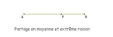On appelle division en moyenne et extrême raison la division d'un segment $[AB]$ par un point intérieur $P$ tel que $\frac{AB}{AP}=\frac{AP}{PB}.$ On dit encore que $P$ est la section dorée du segment $[AB].$ Remarquons aussi que $AP$ est la moyenne géométrique de $AB$ et de $PB$, c'est-à-dire que $$\frac{2}{AP}=\frac{1}{AB}+\frac{1}{PB}.$$ On peut vérifier que cette condition impose que les rapports $\frac{AB}{AP}$ et $\frac{AP}{PB}$ sont égaux au nombre d'or. On dit souvent que pour l'oeil, la division en moyenne et extrême raison est la plus agréable. Ceci rend le nombre d'or très important en architecture. Jugez sur le dessin ci-dessous.