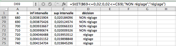 - Les deux techniciens ont de sérieux doutes sur le réglage de la machine et vont chercher à effectuer le contrôle sur un échantillon plus important. Ils construisent alors la feuille de tableur suivante qui permet de déterminer l'intervalle de fluctuation asymptotique au seuil de 95\% pour différentes valeurs de la taille $n$ de l'échantillon prélevé.